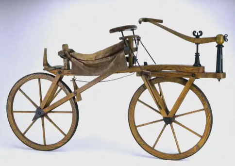 1817年,德国看林人德莱斯对木马轮进行关键改良。他在前轮加装可控制方向的车把,并将鞍座降低至车轮轴心高度,创造出名为"奔跑机"(Laufmaschine)的升级版。这辆重22公斤的木制自行车在曼海姆至施韦青根的试骑中,以4小时完成15公里行程,速度达到当时马车的3倍。尽管仍需双脚蹬地驱动,但方向控制系统的出现,使自行车首次具备实用交通工具的潜质。