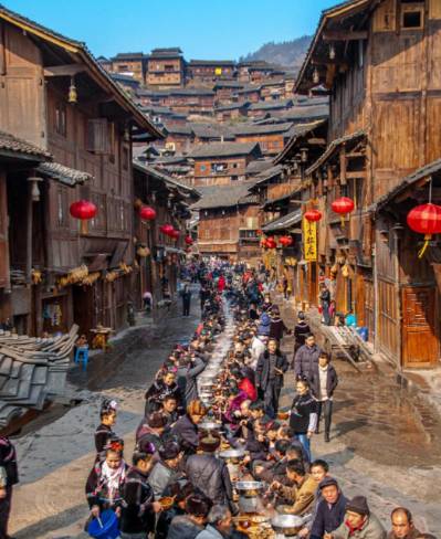 在全球化背景下,苗年正经历着从传统节庆到文化IP的蜕变。雷山县自2015年起打造“苗年文化周”,将传统仪式与现代旅游相结合,推出“万人盛装巡游”“万人芦笙表演”“万人长桌宴”等品牌活动。2025年苗年期间,500米长的长桌宴贯穿县城主干道,来自世界各地的游客与苗族同胞共饮米酒,形成了“民族狂欢”的壮观场景。