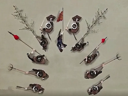 三才阵:变为前、中、后三列,狼筅手和长枪手居中,盾牌手护卫两侧,适合正面突击。